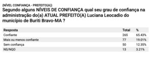 A gestão da Prefeita Luciana Leocádio segue conquistando a confiança e o reconhecimento do povo de Buriti Bravo. Uma pesquisa realizada pelo Census Instituto de Pesquisas, entre os dias 08 e 10 de julho de 2025, revelou que a administração municipal alcançou 84,62% de aprovação na zona rural do município, um resultado expressivo e que reflete as melhorias constantes levadas às comunidades.