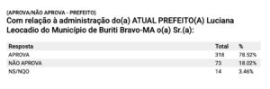 Já no cenário geral do município, a aprovação da administração municipal ficou em 78,52%, enquanto 18,02% disseram não aprovar e 3,46% não souberam ou não opinaram.